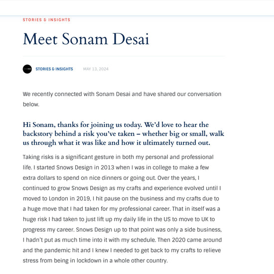 Watch SegmentWe sat down with Seema to talk all about Snows Design and how to uplift the community! Our session was streamed everywhere, including TV Asia!