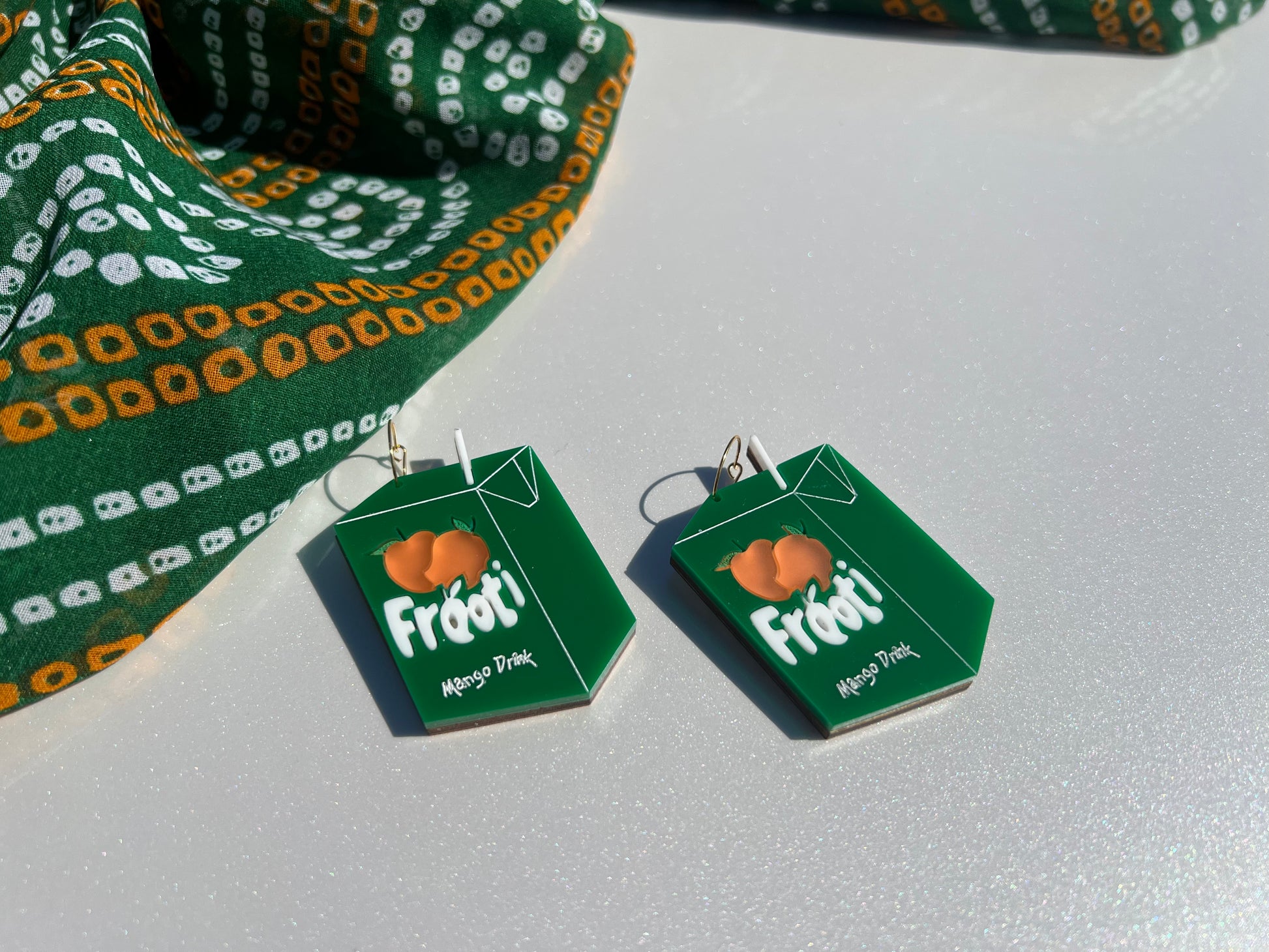 Remember the joy of these green little juice boxes? That iconic mango goodness, sealed in the original green carton, is a taste of pure childhood for so many! Now, you can wear that vibrant, nostalgic feeling with our playful Frooti earrings.