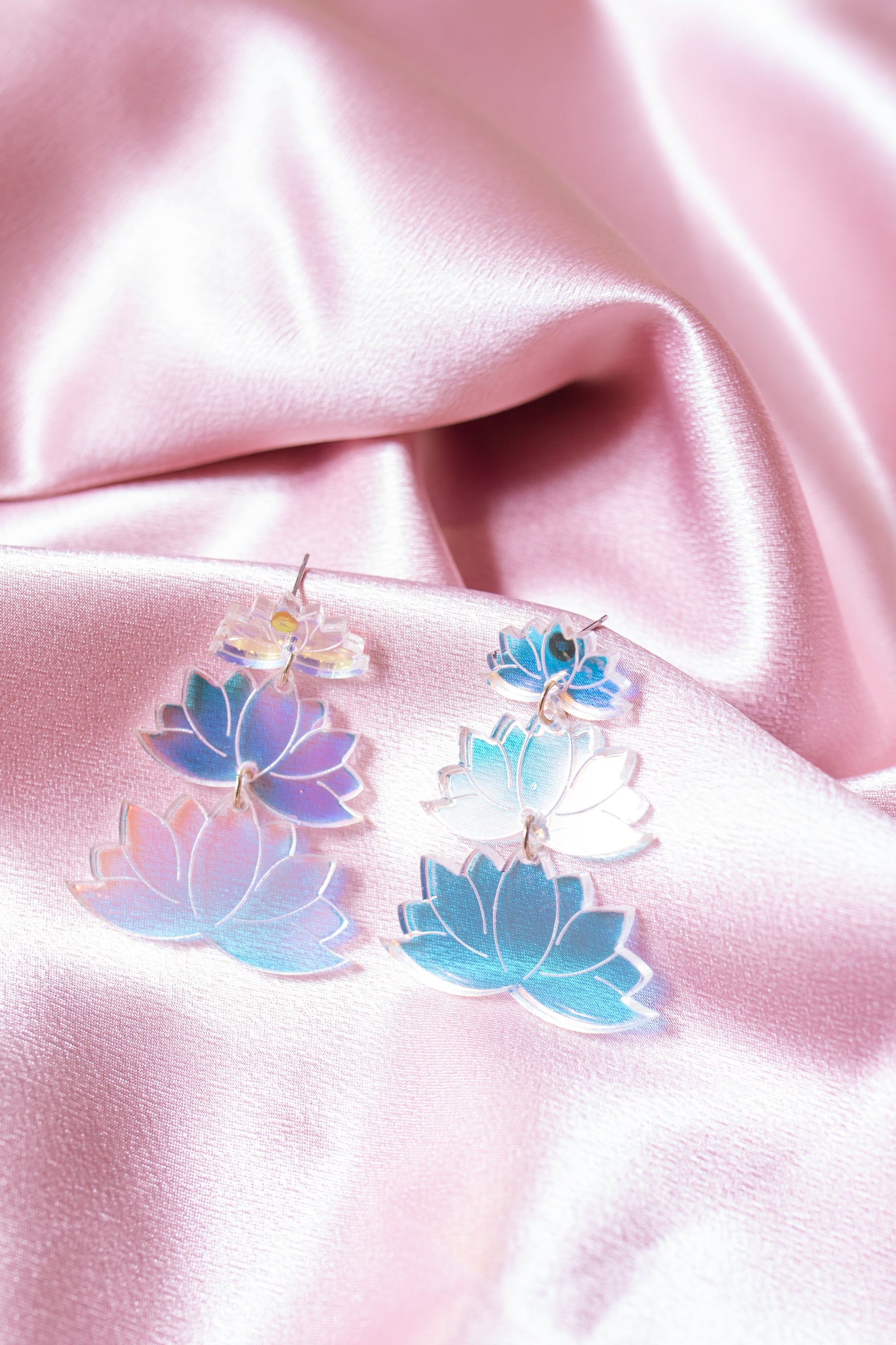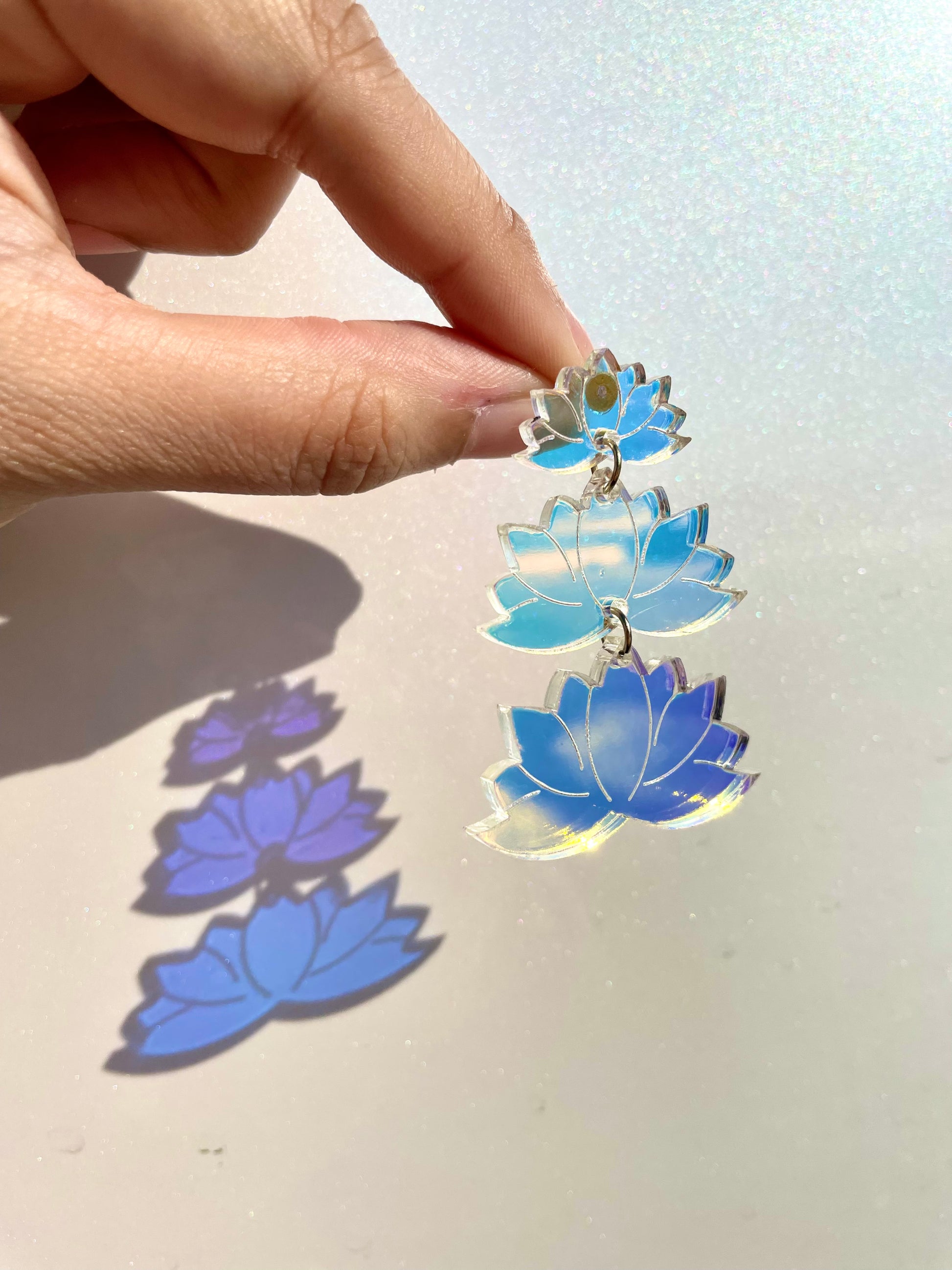 A lotus is a symbol of purity, enlightenment, self regeneration and rebirth. This beautiful flower can be found from swampy areas but grow into this beautiful flower. These lotus earrings are beautifully hand drawn and made with colors that were carefully selected. The rose gold lotus give a surreal appeal of a lotus in real life, and the iridescent lotus brings that unique tranquility of different colors when it hits the lighting in different angles.
