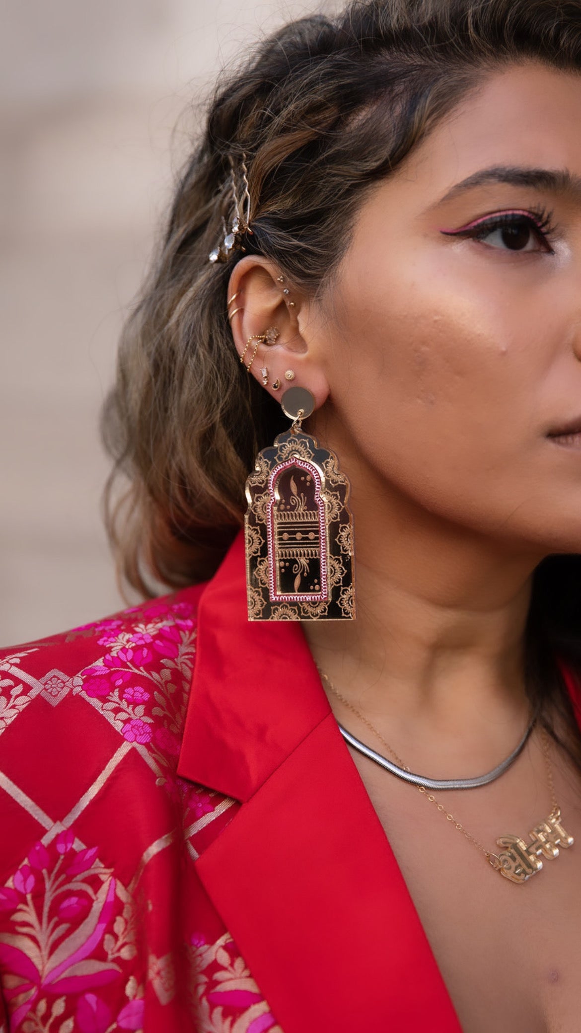 These beautiful Sonam 2.0 earrings are handcrafted and inspired by the Pink City! These intricate earrings are hand drawn with inspirations from the architecture in Jaipur, combined with the beautiful floral designs made with Mendhi. Each earring is assembled and painted by hand, creating the most elegant earring to wear with indowestern wear or traditional wear! And the best part is that they are extremely lightweight weighing at less than 1oz a pair!